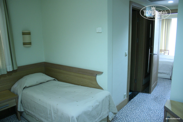Вторая комната предназначена для родителей, есть внутренняя дверь (можно закрыться от детей). В комнате большая кровать с тумбами, письменный стол с чайником и набором чай/кофе/сливки/сахар, чашки. Есть ТВ и минибар (в нем пиво, кола, фанта, вода с газом и без газа). Есть балкон с вешалкой для сушки белья. Покрытие в номере ковровое. Номер симпатичный, мне понравился. По запросу есть 5 видов подушек разной формы и жесткости.