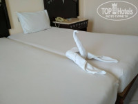 2. Номер. Две односпальные кровати, которые мы сдвинули, столик, стулья, телевизор (было несколько русских каналов), шкаф с зеркалом, бесплатный сейф. В ванной все работало исправно. Вид из окна на заброшенное здание, нам это было не критично, т.к. мы ехали к морю, а не сидеть в номере.