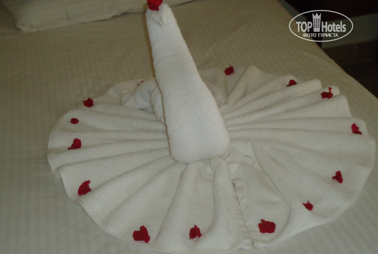 Номер просторный с террасой, которая ограждена для семи номеров. На террасе по два плетенных кресла и маленькому столику для каждого номера. Мы там сушили всё, что было необходимо, ничего не унеслось. Терраса очень просторная, хотелось даже шезлонги там поставить и загорать, т.к. с 8 утра там уже хорошо припекало солнце, а на море было еще прохладновато. В самом номере все работало исправно. Кровати огромные, постель и полотенца чистые, мыльно-рыльное в ванной комнате в наличии. Вода в бутылках пополнялась. Тапок, халатов, идеальной чистоты за эти потраченные деньги на этот тур не ждала. В Египет на мое любимое Красное море приезжаю не первый раз. Именно на МОРЕ))))) Номер нужен на помыться, переспать и сохранить вещи. Сейф работал. Номер убирался ежедневно. Объяснили уборщику, что нужно: "вош фло виз воте" - помыть пол водой, "гив ми тавэл фо лэгз" - добавить полотенце для ног - и все было идеально. Он понимал и по-русски. Оставляли чаевые и маленькие вкусняшки. А теперь на счет чаевых!!! Открою большую военную тайну: чаевые это нормальная практика во всем мире. Надеюсь объяснять не надо, почему иностранцев обслуживают лучше, чем нас? Да-да, чаевые, вежливость, сдержанность! Когда-то в отзывах прочитала: « улыбайтесь, не жлобтесь на благодарность, и будет вам счастье». И таки да))). За весь отдых никто не испортил настроение))).