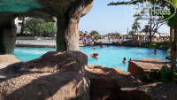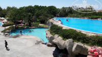 ТЕРРИТОРИЯ . Повторюсь - она шикарна ! Все просто утопает в зелени . Куча бассейнов (по моему штук 8) . В двух бассейнах бар со стульчиками в воде . Здорово ! И классный бассейн с водопадом возле пещеры . В нем прохладная вода даже к вечеру . Возле бассейнов мы не лежали , поэтому насчет свободных лежаков не скажу , вроде были всегда . По крайней мере когда хотели окунуться в какой-либо бассейн лежак для того чтобы бросить вещи находили всегда . В любое время . Неплохие горки . И народу на них не так много . Очень понравилось , что не одна точка смены полотенец . Две на пляже и две или три по территории возле бассейнов . Вообще территория условно делится на две части : тусовочная возле корпуса