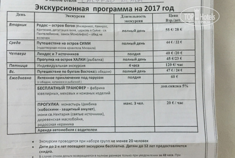 В этом отеле отдыхали второй раз, были в 2016-м году, так что добавить по отелю особо не чего, все нам понравилось, на хорошем уровне и достаточно щедро. Ходили в аквапарк, понравилось, лучше прийти к открытию, чтобы расположиться удобнее, бесплатный паровозик, вверх и вниз. Ездили 2 раза в город Родос погуляли по музеям (исторический музей, дворец "Великих Магистров", картинная галерея), посетили океанариум (кстати в месте расположения океанариума можно отлично понаблюдать за слиянием двух морей, Эгейского и Средиземного и даже икупаться), раза два ходили гулять в "Калитеи" (или "Калифеи"). Брали одну экскурсию и дайвинг в бухте Калитея. Дайвинг совершенно бесполезная трата времени и денег, низкопробный балаган. Экскурсия - Линдос и 7 источников, достаточно интересно. Тур оператор был у нас "Натали-Турс",отельный гид, Светлана, очень замечательная, все вопросы решала быстро и доброжелательно, как и все греки, но видимо туристов было не много и на экскурсию в Линдос (компания которая предоставила экскурсию Travel Exchange) нас отправили со сборной группой из стран Прибалтики гид Алла, (то ли из Литвы или из Латвии), в этой группе из России были только мы (жена, сын и я). Когда в автобусе все расположились гид приветствовала нас так "Сегодня экскурсия будет на русском языке так как у нас сборная группа из Эстонии, Литвы и Латвии". В общем нашу семью она на протяжении всей экскурсии игнорировала, а когда я подошел к ней с вопросом она вообще сказала что мы не с ней и только сверившись со списком ответила на вопрос (подобное поведение гида не делает "чести" экскурсионной компании Travel Exchange). Мне её искренне жаль, даже гостеприимная и щедрая земля Греции не смогли исправить её кривое зеркало восприятия. И такие моменты тоже нужны, понимаешь, что добрых и умных людей больше чем других. Отдохнули изумительно.