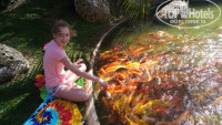 Территория всего комплекса отелей очень красивая и зелёная. Между «Пирамидой» и бассейном расположен шикарный пруд с косяками красивейших золотых разноцветных рыбок, величиной от ладошки до ступни пятидесятого размера. Мы постоянно, после каждого приёма пищи, шли их подкармливать. Зрелище непередаваемо завораживающее, и для детей, и для взрослых. Рыбки Вас встречают ещё на подходе, только головы с открытыми ртами торчат из прозрачной воды. Опоздавшие, запыхавшись, подплывают со всех сторон. Сам процесс кормления представляет собой многослойную драку нескольких сотен цветных рыб с таким плеском и шумом, как будто вода кипит.