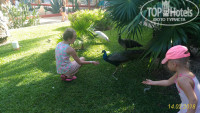 Ещё территория заселена диковинными птицами павлинами. Дети тоже бегали их кормить. Едят прямо с рук. А вечером они залетают на деревянные балки над дорожками, и сидят там как куры на насесте, периодически бомбардируя проходящих под ними отдыхающих.