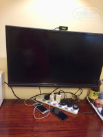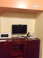 На кухне плоский большой телевизор, холодильник, чайник, микроволновка.