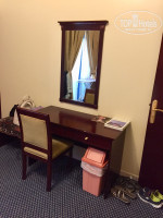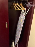 В спальне гардероб, большая кровать, трюмо, стул, столик под сумки. Телефон, утюг, сейф, гладильная доска, тапочки.