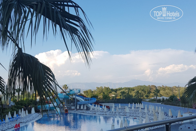 Отдыхали с 14.05.18. по 23.05.18. Отель очень хороший, номера просты, в номере каждый день белоснежные полотенца,гели,шампуни,бальзамы для тела,в холодильнике вода и с газом и без,соки,лимонад, всё ежедневно пополнилось.Еда разнообразная, из фруктов всегда были:апельсины сладкие,яблоки,абрикосы,груши, раза четыри была клубника,арбуз,черешня только на ужин. Алкоголь какой хочешь и круглосуточно)) Басик большой,горки средние но мне понравились ,всегда хватало лежаков , вообще там было очень весело, кто-то танцевал, кто-то кальян курил (цена10$),аниматоры зазывают участвовать в разных играх. До моря ходил автобус каждые 15-30мин.небольшой без стекл чтобы жарко не было, едешь минут пять, можешь пешком минут 15. На пляже с 10 утра алкоголь и напитки, обед с 12 , очень вкусная жаренная рыба, шашлыки, лепешки с сыром. Пляж и море без мусора, но иногда наши туристы бросали чуток. Вечером была анимация для детей в 21:00, для взрослых 21:30 после все шли на балкон у лобби бара, там неплохие коктейли, потом в клуб на первом этаже . Вообщем мне всё норм, но кому как, люди разные, поехал бы я ещё в этот отель, да поехал и советовал бы друзьям. (сори за орфографию, школу прогуливал).