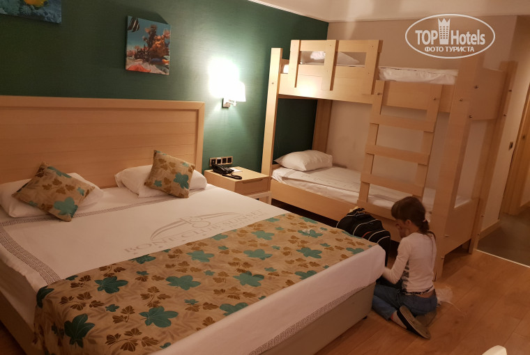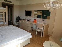 Номер- жили в третьем корпусе, самое оно для тех кто хочет спокойствия особенно по вечерам, в номере все новое, чистенько, уютно! Я была с дочкой 11 лет, нам дали номер с больной двуместной кроватью и одной двуэтажной, плюс небольшой диванчик, телевизор с русскими каналами, холодильник, воду приносят каждый день 1,5 л, душ работал отлично без перебоев, были шампунь , мыло, кондей, гель, ватные палочки и диски кому интересно, кондей не включали, нам было комфортно и без него