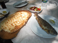 О питании уже много написано, оно скорее для вегетарианцев) Из мяса изредка готовили курицу,часто жесткие куриные потроха, один раз печень.Скумбрия была иногда жареная, но невкусная, а один раз была очень вкусная селедка на огне.Много салатов,овощей свежих и маринованных, тушеных, разной травы, маслин, сыров, готовили вкусные супы,мне очень нравились маленькие пирожочки,один раз готовили шаурму в лаваше-было вкусно.На полдник дают что-то типа турецкой пиццы или картофель фри, гамбургеры.В турецкую ночь давали гезлеме, но не бабушка-турчанка лепешки сама лепила, а работница отеля, как мне показалось,подогревала полуфабрикаты. Еда норм, голодными не будете, но на 7-8 день она очень уже надоедает, ходишь, не знаешь, что бы взять)). Если бы повар готовил из тех же продуктов, но что-то другое, более вкусное вместо нескольких странных салатов, было бы лучше, и отзывы были бы другие, я думаю) Мне показалось, что с увеличением числа отдыхающих в начале июня выбор еды стал хуже, появились небольшие очереди, нужно было приходить к началу приема пищи, т.к. интересное разбирали быстро, кое-какую пищу приносили еще, а что-то нет. Хозяин отеля ел с постояльцами. Сладости в отеле не очень вкусные.Нам понравились разные варенья с блинчиками, но их дают только на завтрак.Мы нашли неподалеку частную кондитерскую и частенько там покупали настоящие турецкие вкусняшки.