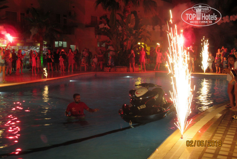 АНИМАТОРЫ молодцы. Детский аниматор Оксана занималась с детками, каждый вечер детская дискотека, правда однообразная, но детям нравилось. Взрослая анимация тоже хороша. Утренняя зарядка, аквааэробика, дартс, боча, танцы у бассейна, водный волейбол. Пока мы отдыхали поприсутствовали: водное шоу, пенная вечеринка, огненное шоу, мистер отель, турецкая ночь в отеле, соревнование между женщинами и мужчинами. Аниматоры МОЛОДЦЫ!!!! Оксана, Ника, Саша, Даша, ведущий с турецким именем (не запомнила) и ди джей (имя тоже не запомнила).