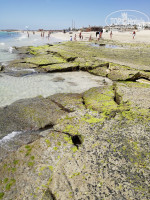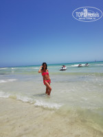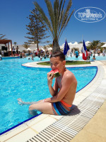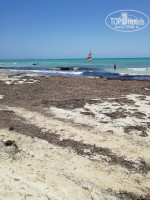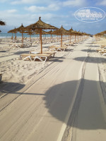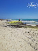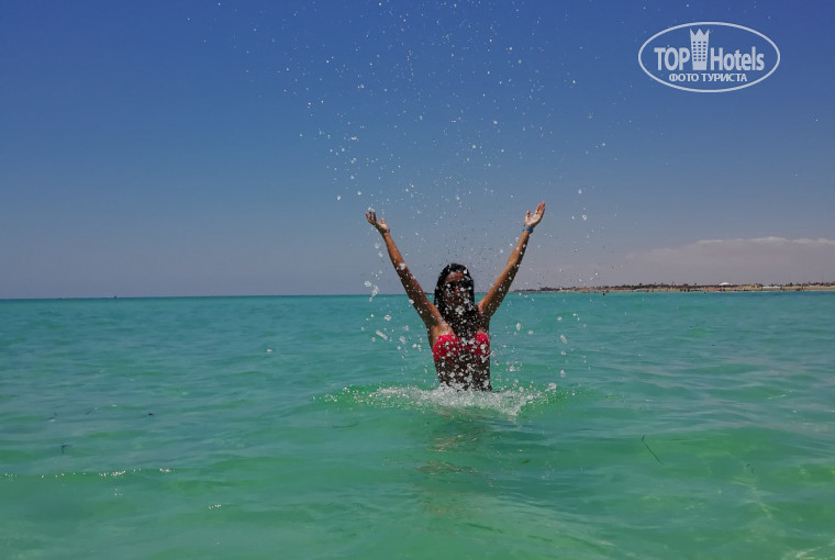 Пляж. Для меня одно разочарование! потому что Тунис в свое время полюбила за белоснежный и чистый песок и шикарный вход в море. Здесь же во всю линию пляжа при входе в море - природная плита, местами разваленная на камни, покрывшаяся зеленью. Так же на пляже было много водорослей, которые убирали редко. Широкая линия песка между шезлонгами и морем грязная....камни, палки, колючки, отходы жизнедеятельности верблюдов и лошадей и др.мусор. Есть пару небольших чистых входов в море - в начале и в конце пляжа. Но весь вид эта плита, конечно, портит - на бережку с детьми не поваляешься, не поиграешься. Само море теплое и просто шикарное!!! Шезлонгов хватает, в рань бежать занимать не надо, но под конец нашего отдыха, при новых заездах в отель, мест на пляже оставалось все меньше и меньше.
