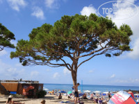 Теперь выходим из отеля и идем на пляж. Мне пляж понравился. Тот, что рядом с отелем в небольшой бухте, где растут сосны (я думаю, что это местные сосны), под которыми можно укрыться от жары. Температура в среднем была 30 градусов и плюс 5 градусов - это от влажности, то есть ощущается как 35. Море чистое, со светлыми песчаными пляжами. Попадаются правда камни в воде, но это ерунда. На пляже есть душ с пресной водой, туалет. Все это бесплатно. Платные лежаки и зонты. Лежак стоит 5 евро. Мы за два лежака и зонт отдали 17 евро, прилично конечно. Рядом есть и большой пляж, но там и людей больше, и укрыться негде от солнышка, сосен там нет.