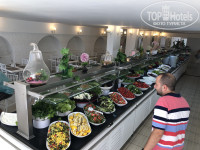 Достаточно просторная столовая на свежем воздухе . 4 раза кормят «завтрак , обед , паёк, ужин» кормят наубой, всегда шведский стол . На ужин всегда арбуз давали . Много фруктов , десертов , салатов , горячего . Для отеля 3* это огромный плюс , мы были удивлены питанию . Объедались очень . Всего хватало .