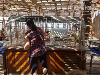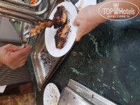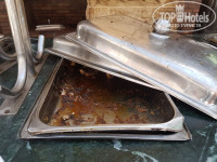 Питание.Кормят утром и вечером в главном ресторане(белые двери на фото-это он и есть),а в обед на пляже под навесом.Пришли мы на свой первый обед в этом отеле и растерялись...Предлагали 1 суп(ребенок есть не смог),нарезанную морковь,синюю и белокачанную капусту,огурцы,сгоревшу курицу,картофель и в общем все.(состояние блюд и чистоту"ресторана"смотрите на фото).
