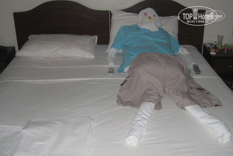 Прилагаю фото композиции, выложенной на кровати моих соседей (которые с ребенком), когда убирали номер. Они когда зашли в номер, их чуть инфаркт не хватил...