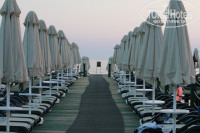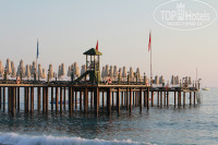Пляж. Смотрели на фотки, думали как жеж до него добираться... оказалось не так страшен чёрт. После завтрака легко до пляжа доходили соовсем неспешным шагом максимум минут за десять. Спуск на лифте до пляжа - аки маленький аттракцион. Сама полоса пляжа около 100 метров побережья. Пляж песочный, ну на турецкий лад, т.е. не желтый чистый песочек. Много зонтиков,лежаков. Вход в воду - слева и справа попадаются валуны-камни, не много, но иногда чувствительно. Посередине такого вообще не замечал. Есть пирс с шезлонгами и зонтами, есть место откуда можно понырять + лестницы, чтоб подняться обратно. + опять же на пляже есть бар со всеми коктейлями - соками - водами + там вроде даже кормят, видел как привозили первое + что-то там же жарилось. Но мы на обед всегда возвращались в домик + обед в основном корпусе. Вот обратная дорога чуть тяжелее - ибо идёшь уже в горку + солнышко уже совсем не утреннее, но всё равно не сильно напрягало + если уж совсем облениться, то есть автобусик курсирующий каждые десять минут, позволяющий сократить подъём.