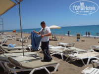 Пляж хороший. Конечно, с Майоркой не сравнить. Но когда я смотрела фото турецких пляжей (в сопоставимой ценовой категории), Сиде мне показался одним из лучших. И правда. Море "мертвое" - ни рыбок, ни водорослей, как я люблю. Цвет воды бирюзовый - значит на дне песок белый. На береговой линии галька. Но она не напрягает, больше досаждают волны. Первые 2 дня была жара 38 С и волны были мелкие, потом температура упала до 30 и на расслаблено уже не плавали, надо было все время контролировать движение воды, чтобы не накрыло. Море от берега сразу глубокое. Пляж в целом убирают, но окурки из песка, конечно, никто не вытаскивает.