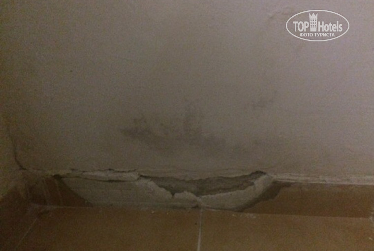 Заселили меня в номер на минус первом этаже. В номере давно не делали ремонт: старая мебель, отколотая на полу плитка, коричневые разводы на зеркале в ванной, подвязанная к потолку труба, на которой висит старая занавеска, разбитая плитка в ванной, разбухшая от воды дверь.
