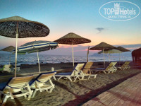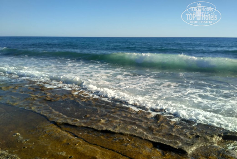 Пляж. Всегда хватало лежаков. Есть передвижные зонты, и это удобно. За пляжем следит Флорида бар. Можно купить напитки у них. Вход в море без плит. Мелкая галька. Море прозрачное, великолепное.