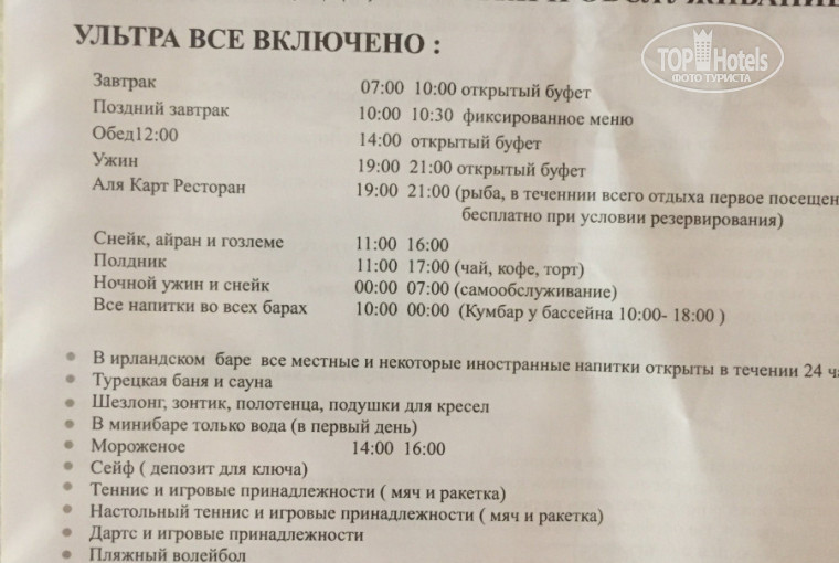 Отдыхали с семьей (мама, сестра) в Турции в первые в период 09 августа по 17 августа 2018 года. Так как вылет у нас был рано утром прибыли в отель ближе к 10,00. Из Москвы в Турцию летели авиакомпанией Пегасус, рейс был задержан на 15 мин это конечно не очень страшно могло быть и хуже, сиденья самолета даже не раскладывались. В самолете кормили замороженным бутербродом (внутри лист салата и красный сладкий перец) лучше бы не кушала. Обратно летели авиакомпанией РОЯЛ ФЛАЙТ, самолет был намного лучше, как по комфорту, так и по еде. По приезду в отель заселили нас сразу, так как были места. Номер открывался с помощью обычного ключа так как карточка не работала, но мы везде искали свои плюсы, так как не хотелось себя огорчать отрицательными эмоциями, электронную карточку нам тоже выдали, плюс этой карточки был только в кондиционере т.е. на период своего ухода из номера мы его оставляли включенным, а когда приходили в номер в комнате всегда было свежо. После заселения в 10,20 мы пошли на поздний завтрак если честно я немного даже подрастроилась нормальной еды к этому времени уже не было нас спасло, что собой мы брали фрукты и булочки. Обед мы проспали так как очень устали с дороги, зато успели на полдник к 16,00.