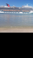 Там возле причала пляж...на него выходят люди с лайнера купаться...он как в заливе находится...нет волн...очень спокойный океан ...можно искупаться тоже
