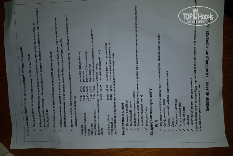Также официанты ходят вокруг тебя и убирают столы и при этом постоянно громко разговаривают между собой на местном языке,а также начинают тебя выгонять за 10 минут до срока окончания обеда - вообщем хамло,если идешь брать напитки до обеденного времени то начинают запрещать и отгонять от автоматов - хотя вроде как оллинкюзив мать его! Вообщем персонал хамло,никакого вам хэлло и улыбок - у всех вид как будто ты им чем то обязан и вообще если не платишь чаевых(за что?) то катись отсюда.