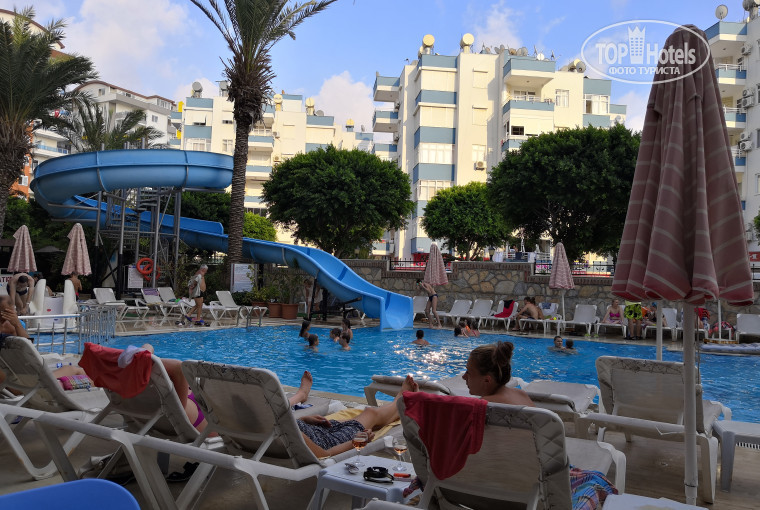 Сразу хочу отметить, что с мужем за границей были первый раз. Поэтому, когда выбрала отель, прочитала много отзывов и морально подготовилась. 1. Доставка до отеля. На самом деле время у всех разное, это зависит от количества отелей, куда будут завозить по пути. По отзывам многие пишут, что 3 и даже 4 часа. Нас везли 2.5, потому что по остановке мы были 3 по счету, после нас ещё были пассажиры в другие отели. Поэтому предугадать точное время от Анталии до отеля не возможно.Кстати, ночью у них ночной суп, поэтому после дороги мы с удовольствием покушали. 2. Заселение. Ну тут, кому как повезёт) Мы бронировали номер стандарт, но в отель прибыли где-то в 3 часа ночи, поэтому нас заселили в то, что было. Номер был ужасный, заострять внимание на нём не буду. На следующее утро я пошла на ресеп и попросила сменить номер, вообщем попросили прийти после 12. Когда подошли повторно, нас пытались убедить, что это номер стандарт и очень хороший) Дабы не скандалить и не доплачивать (вымагают за номера у всех), я сказала, что возьму в номере сейф (2 доллара в день, мы планировали изначально его брать) и вуаля), нам предоставили номер в 4 блоке (сам отель состоит из 5 блоков) на 4 этаже. Номер был чистый, свежий с выходом на дорогу. Вообще мебель, конечно старенькая, но в номере есть всё :телевизор (3 канала на русском), кондиционер, шкаф, две тумбочки, холодильник, туалет, душ. Самое главное не было запаха гнили и сырости, что нас и устроило. Меняли полотенца и постельное бельё. 3. Питание и алкоголь. Мяса нет))) есть курица и соя, рыба через день. Так же давали мороженое через день, море зелени, вкусные сыры у них, сладости, супы, фрукты. А вообще всё было много и вкусно, питанием мы остались довольны. Бар работает с 10 утра и до 11 вечера, вино, пиво (очень вкусное), водка, джин, коктейли. К напитками и еде вообще нет претензий. 4. Пляж. Подземный переход за 2 минуты. Море чистое, многие писали, что не нравится заход. Действительно местами есть плиты, но есть и где зайти можно легко. На пляжи закуски, напитки, алкоголя нет. 5.На встрече с гидом он упорно впаривает экскурсии (вообще ходить на встречу с ним не обязательно). Через дорогу у д. Миши в два раза дешевле. Здесь много отзывов о нём, тоже заострять внимание не буду. 6. Сам отель. Есть бассейн с горкой, не большой и не маленький, в жару ополоснуться можно. Сама территория не большая, цветущих садов нет, но пойдёт. Вообщем общее впечатление хорошее, считаю, что за такие деньги отдых получился отличным, а хорошо зарабатывающим и слишком притязательным лучше ехать в 5+.