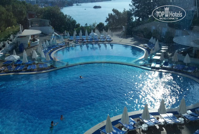 Отдыхали семьей с 5 октября. Все по порядку: Вылет из Москвы почти в 3 ночи. Летели Азур эйр. Вылет не задержали. Все четко. В самолете кормили. В отель приехали примерно в 10 часов утра. Сразу одели браслеты. Сказали что можно оставить чемоданы в комнате хранения и идти на завтрак. Заселение в 14-00. До заселения успели осмотреть территорию и поплавать в бассейне т.к предусмотрительно переодевашку и купальные принадлежности положили в отдельную сумочку. 1. Заселение в 14-00 приятная новость мы оказались счастливчиками и выиграли вид на море. Номер на 0 этаже 1407 прекрасный вид на море и на бассейны. В номере чисто. В мини баре: фанта, кола, вода. Удивили тапочки, точнее их качество и количество на 3 человек всего 2 пары. В тапочках чувствуешь себя так, как будто их нет совсем. Уборка номера ежедневно, если не включишь "Не беспокоить" . Если оствить чаевые, то все тщательно помоют, наполнят бар и побрызгают очень приятным освежителем воздуха, скрутят лебедя.2. Территория отеля большая, зеленая есть плодовые деревья бананы, финики. Есть тенисная, волейбольная площака, днем можно поиграть в дартс. На территории Аква парка есть отличная смотровая площадка с оболденным видом. В отеле 2 басейна на минус 3 этаже, один на крыше 18+ , 3 в аквапарке. 3. Питание: разнообразное: курица, рыба 2 вида: в основном селедка на пару или тушеная с овощами, иногда давали жареную красную, множество салатов и овощей, мясо тушеное, котлетки, печень, на веранде плов, и пекли лепешки, рагу овощное с мясом, баклажаны, кабачки фаршированные.Один раз давали мидии на ужин, но нам они не достались. т.к мы пришли часов в восемь. Разнообразие сыров. Десерты (пудинги, тортики, пахлава. Из фруктов: апельсины, яблоки, сливы, местные мандарины. На завтрак курага, инжир. Соки из автомата разводные не все автоматы работали. 4.Пляж трехуровневый пирс. Нам пляж понравился. Ребенок с удовольствием прыгал с понтона и разглядывал множество рыбок, которые плавали возле берега. 5. Экскурсии если хотите ехать на комфортабельном автобусе берите у гида. Мы одну взяли на базаре и 10 раз пожалели т.к во первых была задержка автобуса. Автобус, если его можно так назвать открытый дребежящий того гляди развалиться. дуло отовсюду хорошо взяли полотенце смогли накрыть ребенка. Потом была пересадка на каком -то базаре в др автобус 2х этажный, но опять же открытый. По приезду на Пляж Клеопатры у вас есть 2 часа свободного времени. Во всех достопримечательностях нужно платить дополнительно.Пещера Домлатаж 6 лир с человека. Канатная дорога тоже доп. плата. Пляж клеопатры очень красивый -советую. Обратная дорога по тому же прицепу с пересадкой. Вторую экскурсию в Парк Легенда с аквапарком и парком атракционов(местные называют "Диснейлендом") взяли у гида ехали в комфортабельном автобусе. В самом парке очень много народу в Аквапарке смогли прокатиться только на одной горке отстояв при этом мин 40. Для нас показалось бесцельно потраченые 130 баксов на троих. 6. Анимация днем в отеле отсутствует. Вечером после ужина до анимации играет Джазовая музыка. За неделю успела надоесть. Спасали соседи у которых играла своя музыка более современная. Вечернее шоу начиналось в 22-00.Детское с 21-00 всегда однообразное. Один раз попали на мультик- мутик. Про "Червячков каких то". Это просто кошмар. Такого мы еще не видели. Если уж по расписанию мультик то 