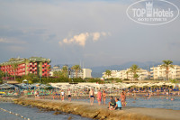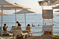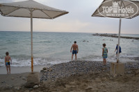На пляже лежаки всегда находились.Хотя и были люди,кто занимались резервацией полотенцами.Администрация предупреждает,что полотенца будут изыматься,но народ не из пугливых-Сам не приду и другому лечь не дам...Заход в море нормальный.С начало крупные камушки,потом песок.Но если вы в купальных тапочках,то вам это помехой не будет.Чистый песок чуть правее на соседнем пляже.Куда желающие ходили без проблем.