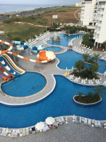Бассейны чистые, каждый день их пылесосят, берут какие то анализы 3 раза в день, лежаков достаточно, полы возле них моют каждый день