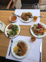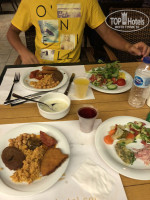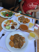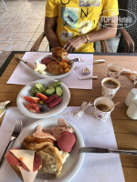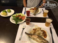 2. Еда. Ну такооооооооое))) Достаточно скудно и однообразно, особенно на завтраке, но мы не голодали, всё ели (прикреплю стопицот фоток еды). Соки - юпи, вода, кофе и чай. Из алкоголя - более или менее сносное белое вино. Очень нравился на ужине салат из консервированных овощей и фруктов (зеленая слива, зеленый абрикос). Прям не хуже нашей квашеной капусточки! просто офигенный! Я люблю соленое, поэтому всегда на на ужине себе его накладывала. Однажды была рыба. Ну а так - без изысков.