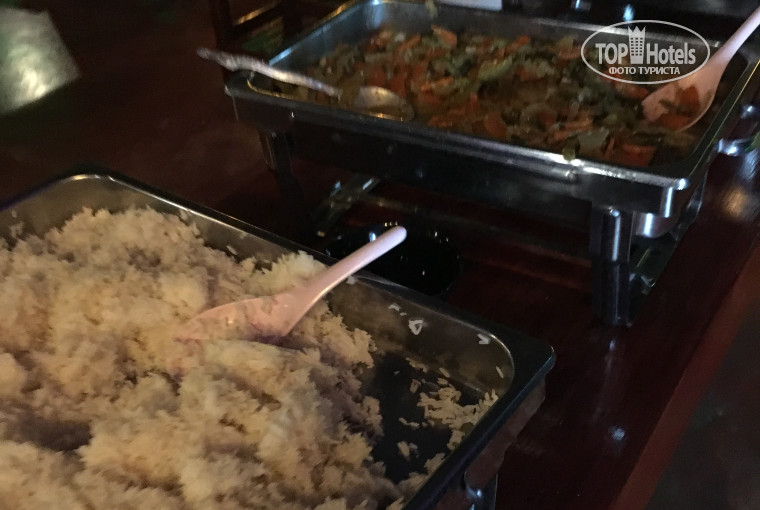 Ужин был вкусный, но не особо разнообразный: тушеные овощи, овощной салат, рис, макароны и барбекю (курица или свинина), ну и чай, кофе, фрукты. Завтрак тоже: яйца, сосиски, рис, огурцы и помидоры, также чай, кофе, вода и фрукты. Вполне неплохо.