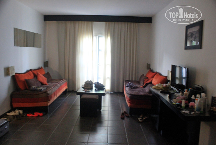 НОМЕР 341: большой, светлый, с двумя кроватями с одной спинкой, двумя диванчиками напротив друг друга, балкончиком со столиком и двумя стульями там, с довольно просторной ванной комнатой. Мебель в номере простая, но основательная. Ванная комната довольно просторная, хотя и не огромная. Более всего радовал вид на океан – сразу было видно, что там и как на пляже и с океаном… С другой стороны от номера была большая общая галерея с видом на ресторан и боковым видом на бассейн и основной корпус. Никакого особого шума мы не слышали, кроме музыки перед ужином в «марокканские» дни, когда гостей перед рестораном встречал этнический коллектив и верблюд. Но особых неудобств это не доставляло. Я лично не большой поклонник национальной берберской музыки, но всё равно всё это очень поднимало настроение, было весело.