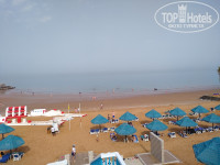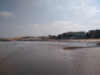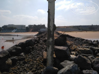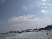 Пляж: вход на пляж усыпан строительным мусором (мозаикой и застывшим раствором). Ближе к морю чисто. Моря нет до обеда. Отлив. Возле буйков по пояс. Море холодное 22 градуса. Чистое.