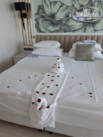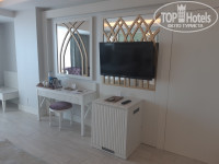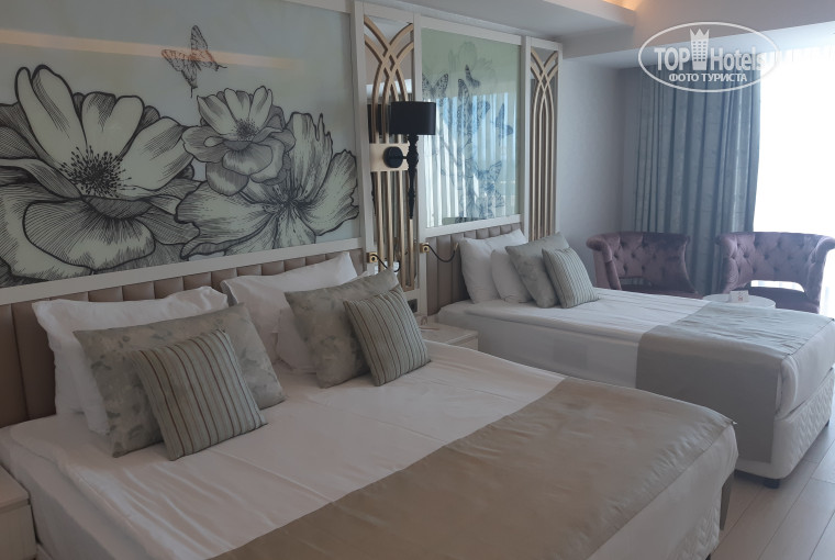 У нас был забронирован с видом на море. Мы получили на пятом этаже в самом торце. Вид из номера был великолепный (если не смотреть в сторону речки, правда через несколько дней и она нас не смущала). Сам номер большой с огромной двуспальной и односпальной кроватями, два кресла со столиком, холодильник в котором вода, сок, лимонады, пиво (почему-то только одно на двух взрослых), но мы кроме воды ничего не употребляли. Есть чайный набор. В коридорчике большой шкаф, все войдет, но есть в нем один минус: он совсем не приспособлен к длинным женским платьям. Мне оказалось мало вешалок, попросила, принесли ещё.