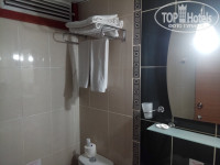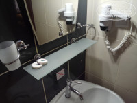 Номер стандартный. Ничего особенного. Есть небольшие огрехи в виде сколов на кафеле в душевой комнате или отсутствующий диспенсер около раковины (только отверстия от его крепления). Есть фен, пара кусочков мыла, набор полотенец (тапочек нет), и диспенсер с гелем для душа. На балкончике пара стульев, столик и сушилка для одежды.