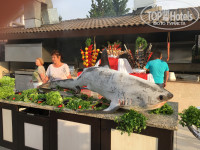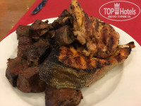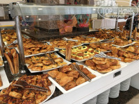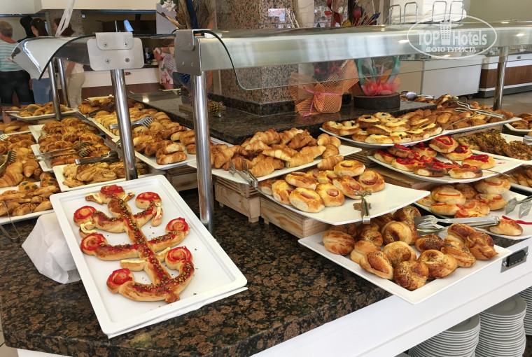 ПИТАНИЕ - разнообразное и вкусное. На завтраке можно сделать свежевыжатый апельсиновый сок. Более 20 видов булочек! Молочная каша, омлет, яичница. Вкуснейшая лазанья. Понедельник рыбный день. Жарили лосось. Перед входом в ресторан повар готовил красивое блюдо из красной рыбы (см.фото). Среда - турецкая ночь. В эти дни давали арбуз (два раза, видимо ещё не сезон для них был). Из фруктов были только яблоки, апельсины, грейпфруты и твёрдые груши. Один раз на ужин давали клубнику и мушмулу. Обилие мясных блюд! Каждый день были: морской окунь либо карась, скумбрия на гриле, куры гриль, баранина, мясная шаурма, соте из циплёнка, тефтели, кебаб, тушенная рыба с овощами, вкуснейший шашлык из индейки! Давали картофельные и мясные наггетсы, пиццу, отбивную из курицы, баранью печень. Попробуйте бамию, она похожа на зеленый перец, на вкус очень вкусна. Также очень понравился твороженный десерт, его обычно давали на ужин.