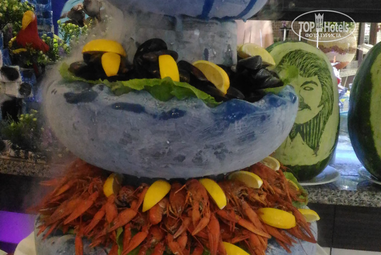 Питание.супер.каждый день новое тематическое(неаполитанская кузня,азиатская кухня,тайская,день морепродуктов,турецкая ночь) разнообразие бешеное всего не попробуешь и рыба и мясо и раки, мидий, и на улице мясо жарят ,выпечка,сладости улет,каждый день все новое,свежее,красивое,вкусное,вообщем до отвала все .оформлено на высшем уровне,живая музыка,оффицианты вежливы,улыбчивы,сразу разливают водичку,приносят напитки какие пожелаете.