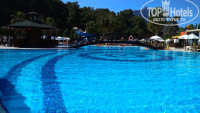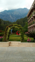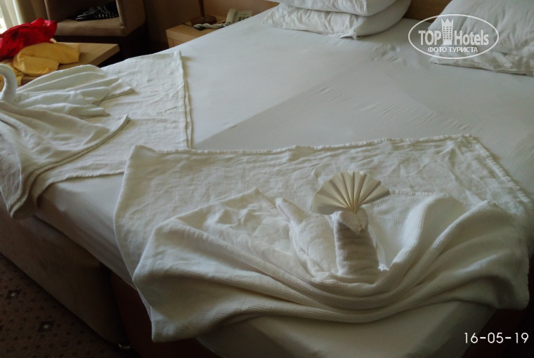 Оставлю и я свой первый отзыв. Отдыхали вдвоем с 10 по 19 мая. Отель сразу понравился, красивый, и на улице, и внутри, но я это всё просмотрела ещё до приезда в интернете. Территория маленькая, погулять негде, но вся в цветах, пальмы, фонтан, вечером подсветка везде- очень красиво!!! Бассейн с лежаками и зонтами, мы в жару с моря уходили сюда поплавать перед обедом. Пару раз я попала на занятия аквааэробикой- супер! Номер: у нас был с видом на бассейн и горы, вид- шикарный, убирался номер регулярно, шампунь, гель, мыло пополняли постоянно, при заселении в минибаре было две бутылки воды по 0,5л. Вечером в номере очень шумно с 20-30 до 23ч. Еда- курица реально надоела, рыба почти всегда не вкусная, котлетки- из чего их готовили? Один раз взяли и всё, супы- это нечто непонятное, фрукты- яблоки (не ем), апельсины, но слева и справа от отеля- клубника, черешня,абрикосы, арбузы по нормальной цене, мы брали. Овощи- много, огурцы, помидоры, по разному нарезаны- кружочками, дольками, всё вместе и по отдельности, много зелени, оливки, конс.кукуруза, салат с капусты- никакой😑, очень жаль, что, когда была цветная капуста- она была опять же не вкусно приготовлена. Зато очень часто были баклажаны- разные, и вкусно. На завтраках хорошая выпечка- это плюс! Сладости на обед и ужин- нам не понравились, много, на вид красиво, но однообразно, и на вкус не очень. Но в общем по еде- голодными не ходили, всё равно что нибудь можно найти на свой вкус. Напитки- не понравилось, что в лобби баре и у бассейна бармены наливают спиртное, как будто они его из дома принесли, и вам его бесплатно отдают. В первый день в лобби баре попросили два Бейлис, дали 2 евро, бармен с таким видом их взял😏 и не понятно, почему нигде не указано, что есть в баре- после 7 дней отдыха (из 9) нас знакомая "угощала" возле бассейна Малибу. В лобби бар мы вообще перестали ходить, в ресторане бармен был приятный парень. Пляж- хороший, но заход в воду- камни, берите коралки, также на пляже есть бар. Подведу итог: в общем, отдых удался, может быть ещё сюда приедем. Отель рекомендую, с детками очень хорошо будет.