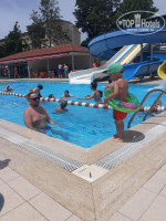 Ещё на территории 2 бассейна. Один с горками (работает с 10 до 13 и с 15 до 17. Рядом лягушатник для малышей с горкой. И второй просто бассейн, рядом тоже лягушатник. Бассейны каждый вечер чистят (сидя на ужине часто видели).