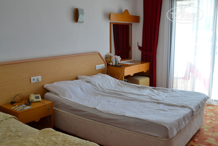 Начнём с заселения. Приехали мы ладно к 2 часам, нам сразу предложили доплатит 7 баксов за номер с видом на море,но за такие номера я бы и 100 рублей не стала бы платить. Мы отказались, сказали что денег нет, на что нам молодой администратор, мелкий гном сказал, что у нас есть дома соц помощи обратитесь туда, может вам помогут там. Нормально? Теперь о номере, мебель наверно веков правления Ататюрка. Вся разваливается. Фен два раза чинили и он все равно не работал. Ванна обшарпанная вся, занавеска в ванной уже заплесневела. Душ брызжет во все стороны!Полотенце и постельное не белоснежное белое, далеко! Пятна! При заезде мне вообще показалось, что его не меняли после предыдущих отдыхающих. Потом нам довелось узнать, что оказывается на 5 этаже мебель новая и сделан небольшой ремонт. Муж пошёл просить поменять номер, так как жить в таком номере, да даже просто мыться было невозможно,естественно прозвучала сумма в долларах для замены номера. Через гида удалось поменять номер, но не на 5 этаже, состояние номера было немного лучше предыдущего. По поводу уборки я вообще молчу. Воду ставили да, мусор выносили , но за все время после смены номера не разу не пылесосили. Один раз нам типо поменяли полотенце, просто подняли его с пола и повешали на крючок,благо я заметила до этого пятно на полотенце и по нему определила что это грязное полотенце. Сервис просто огонь.