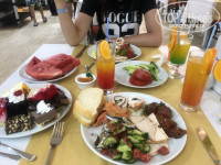 В ресторане всегда чистые тарелки, вилки, ножи, официанты просто умнички, убирают грязную посуду моментально. Огромное разнообразие блюд: курица, индейка, рыба, много вариантов нарезки сыров, колбас, овощей, всегда было несколько видов макарон, картошка фри, иногда было пюре. Огромный выбор сладостей.В общем голодными мы никогда не были. К ресторану претензий нет, только слова благодарности.