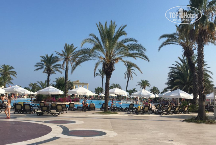 Территория отеля составляет 180.000 м2. В отеле одно большое четырехэтажное здание и очень много вилл. Основной контингент отдыхающих-семьи с детьми. Приехали в отель в 9:00,сходили на завтрак, прогулялись по территории, в 11:30 нас заселили в основной корпус. Номер стандарт, с огромной двуспальной кроватью. В номерах сейф и мини-бар бесплатно. Мини-бар ежедневно пополняется безалкогольными напитками: сок, вода, минеральная вода, пепси, фанта. По запросу бесплатно в номер предоставляют - детский горшок, раскладной манеж, чайник, покрывала, одеяла и т.д. По всей территории отеля расположены бары,лобби- бар круглосуточно работает, с двух часов ночи до восьми утра алкогольные напитки предоставляются за дополнительную оплату. Второй бар в главном корпусе работает с десяти утра до двенадцати ночи .Бар в главном ресторане работает во время каждого приема пищи. Бары Бар у главного бассейна работает с десяти утра до двенадцати ночи.Во всех барах предлагаются местные и импортные алкогольные и безалкогольные напитки.Отдыхающих в отеле очень много, всвязи с этим функционирует три ресторана: Максимус (красный цвет браслета, проводится завтрак (поздний завтрак), обед, ужин), Нона (чёрный цвет браслета, проводится завтрак (поздний завтрак), обед, ужин), Новелла Ланата (темно-синий браслет, проводится завтрак (поздний завтрак), обед, ужин, поздний ужин. Есть детский ресторан, с детским меню, блендером и микроволновкой . Детский городок очень большой, есть комната сна, детский бассейн с горками, игровая комната, песочница, лабиринт, кинотеатр, мини-амфитеатр, в котором ежедневно проходят мини-дискотеки для детей, карусель (платно), игровые автоматы (платно). Для взрослых по средам и по субботам проходятся тематические вечеринки (белая вечеринка и красная вечеринка), приезжают профессиональные танцоры, несколько раз в неделю проходятся шоу в амфитеатре ,выступают танцевальные коллективы. Питание как и во многих отелях Турции-много, вкусно, разнообразно. Всегда была курица, индейка, говядина, рыба, баранина. Пару раз была утка, мидии и суши. Из фруктов черешня(на ужин), арбуз(обед, ужин), яблоки, апельсины, слива, абрикосы, нектарины. Места в главном ресторане есть всегда, официанты молодцы, очень внимательны и отзывчивы. Отель оставил очень приятное впечатление, отдых удался.