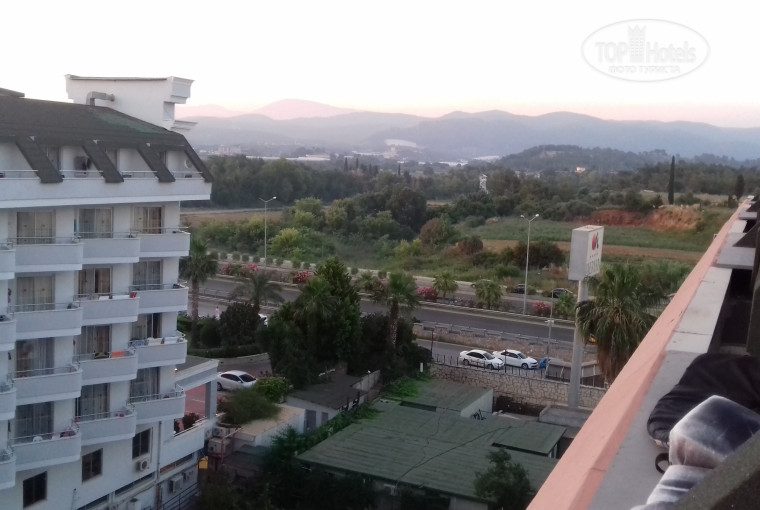 Вид боковой :слева-море, справа дорога и холмы,прямо-на соседний отель Holiday garden. Был некоторый шум от ресторана этого отеля,но он абсолютно не мешал. В других отзывах читала про посторонний запах... У нас он был только в день заезда и то до 2-х ночи, все последующие дни-все отлично)