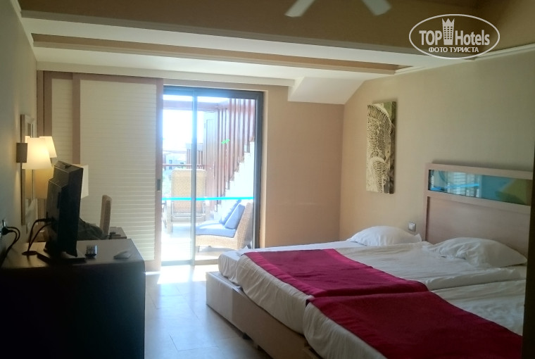 Прилетели рано утром 30 июня, в отель добирались примерно 3 часа (с заездом в 4-5 отелей). Заселили около 12 часов, в отличный и удобный номер 1211 в первом корпусе, с огромным балконом с выходом к бассейну, с видом на гольф-поля и частично на море и горы (очень красиво). Номер большой, в ванной и правда дверь - стекло матовое и еще одно стекло в спальню, но оно задвигается дверью-купе, так что не так все критично, как многие пишут ))) До моря идти минут 5, до ресторана 3 минутки. Из дальних корпусов можно добираться и по 20 минут, так-что считаю, что нам повезло с номером, ничего не доплачивали. Холодильник в номере пополняется ежедневно (пиво, фанта, кола, вода - все по 2 бутылки). У нас не работал сейф и телефон, сообщили об этом гастрелейшн (столик с право при входе в отель, русскоговорящие девушки, телефон 7777) в течении 15 минут пришел мастер и все починил. Кондиционер не справлялся, у нас стояло на минимум (фотку приложу) и было в номер градуса 23 не меньше.