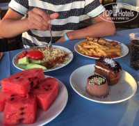 Питание без изысков, но голодными не останетесь. На обед и ужин всегда было мясо ( курица, говядина, баранина). Из фруктов персики, сливы, яблоки, апельсины, арбуз. Хоть обычно в турецких отелях десерты меня не впечатляли, здесь можно было найти вкусный десерт. Спиртное качественное: коньяк, виски, вино, водка, джин, пиво.Наливают из бутылок.