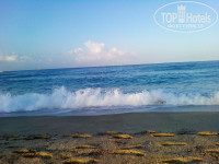 Здесь многие удивляются, почему люди приезжают на море и сидят у бассейна. Я объясню. В этом году зимой было много штормов и размыло каменную плиту у берега, которая обычно засыпана песком. Плита относительно ровная, начинается, когда заходишь по пояс. она скользкая. При сильных волнах во время прыжков можно выбить колено, если поскользнуться. Это актуально для тех, кто, как я, не умеет плавать.