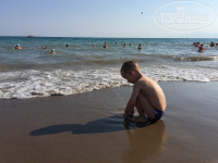 Песочек. Ближе к берегу галька, на входе в море тоже галька с песком, а дальше дно песочное. Море в июле внизу было не прогретым, сверху очень теплое,в конце июле море стало идеальном тёплым,комфортным. Много лежаков. Если до 9 придёте-успеете выбрать удобные. Места с 10-12 уже проблематичнее выбрать,особенно если вы большой компанией отдыхаете и хотите рядом лежать. Как правило народ к 13 часам освобождает лежаки и уходит обедать, потом возвращается к 16ч. Есть павильоны отдельные, аренда от 30 долларов,узнавать на ресепшене.