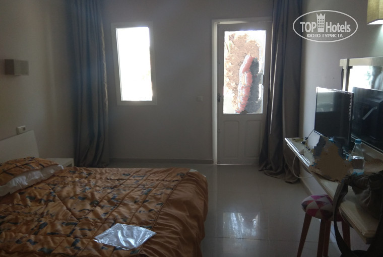 Ничего супер страшного мы там не нашли... 2 кроватки составлены рядышком (нам было это даже в кайф, тк пекло то еще... Обнимашек вообще не хотелось). Тв с одиноким русскоязычным орт (у нас была не крупная плазма, с usb входом, так что если вам очень нужно что то смотреть кроме тупеньких ток-шоу германского ОРТ, то качайте на флешку и смотрите на здоровье))