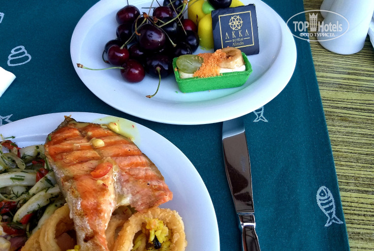 Питание. Еды много. Еда вкусная. Обилие морепродуктов. Мидии в разных вариациях всегда. Если это не основное блюдо, то в салатах всегда есть. То же самое с кальмарами. Стейки форели застали два раза за 10 дней, раков давали раза 4. Один раз роллы(не очень) но это на любителя. Рыба типо сибасис и т.п. каждый день. Мясного тоже полно. Антрекот, говядина, телятина и т.п. Вообщем голодным точно не останешься . Все очень вкусно. Фруктовый стол хорош. Ананасы, черешня!, инжир, банан, персики, апельсины, арбузы, бананы, дыни, яблоки, виноград... Вообщем на любителя. Сладкого много. Традиционные пирожные и турецкая пахлава. Официанты обходительны, но последние два дня нам не везло... Приходилось самим искать официантов и просить напитки, потому что бокалов то на столе нет))). Мухи- они есть. Особенно на терассе. Довольно навязчивы. Есть особи крупные, которые пытаются с твоей тарелки стянуть кусок мясного. Лайфак. Оторвите маленький кусок мяса, тварь летающая его подхватит и улетит от вас.