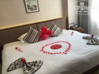 Заселение в 13:00 на 8 этаж, номер 827. Окна выходили на часть ТЦ и горы, виден был кусочек моря. Номер был для молодожен ( турагент так указал при покупке), приятно удивило оформление(фото приложу). Обустройство номера: несколько шкафов для одежды с вешалками( там 2 халата, 2 пары резиновых тапочек и 2 пары белых тапочек), есть сушилка, холодильник,сейф(не пользовались), чайник, чай, чашки, телевизор( с 230 китайскими каналами и 1 американским ). В ванной комнате: набор зубная щетка+паста, гребень, станок, мыло, шапочка для душа, ватные палочки, вата, пилка для ногтей- все по 2; так же гель для душа и он же шампунь :) Все перечисленное пополняется ежедневно по мере использования! Полотенца только белого цвета.
